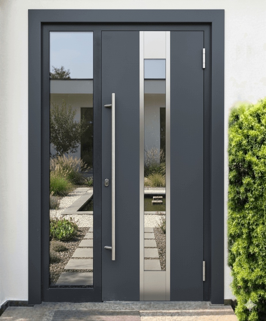 Дверь в дом Calida дает возможность подбора фурнитуры различного вида на усмотрение клиента. Отличительная черта модели CB62-5 и CB72-5 – одна прямоугольная вставка из стеклопакета, обрамленная рамкой из нержавеющей стали.