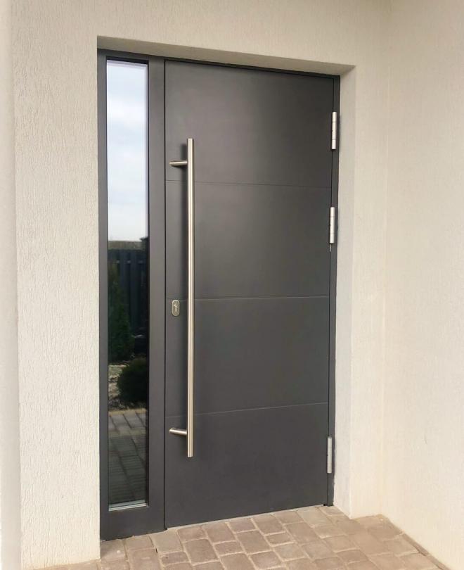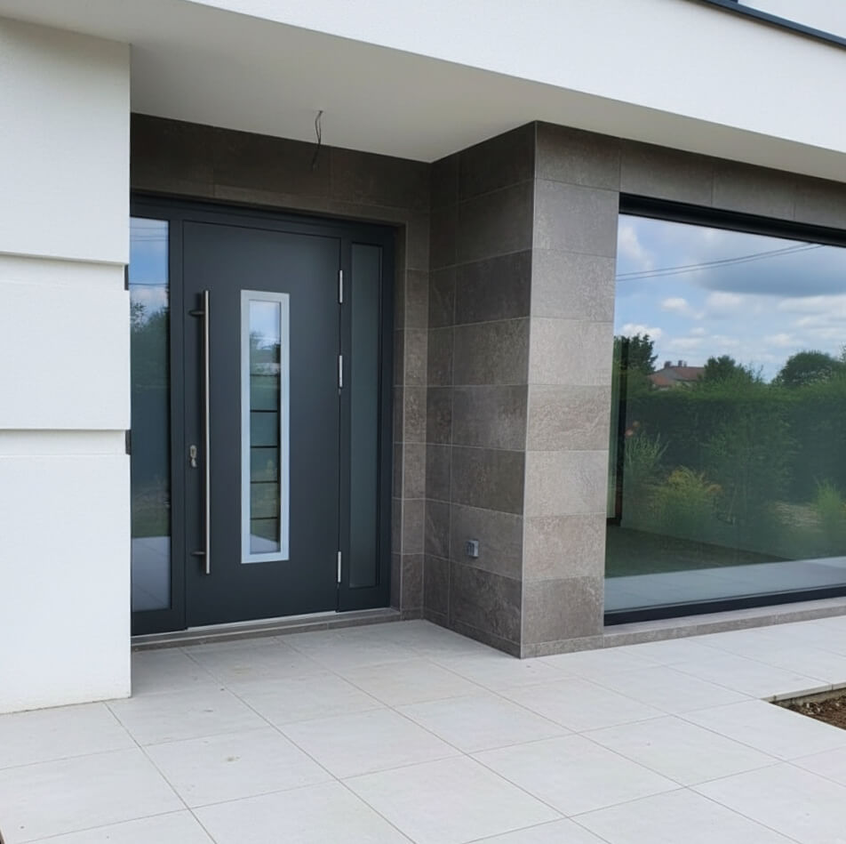 Дверь в дом из газосиликата Calida Basic — это современное и практичное решение для частного дома или коттеджа. Она сочетает прочный алюминиевый профиль с терморазрывом, отличную тепло- и звукоизоляцию и минималистичный современный дизайн, который гармонично вписывается в фасад газосиликатного дома.