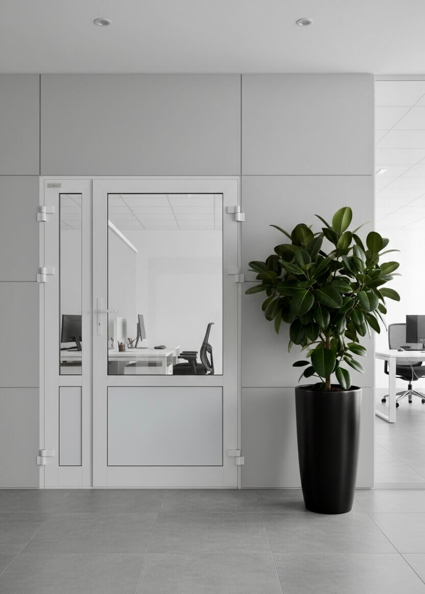 Полуторные алюминиевые двери — практичное и функциональное решение для частных домов, коттеджей и коммерческих помещений. Конструкция состоит из основной створки и дополнительной боковой части, которая может быть глухой или открывающейся. Такое решение удобно для повседневного использования и позволяет расширить проём при необходимости.