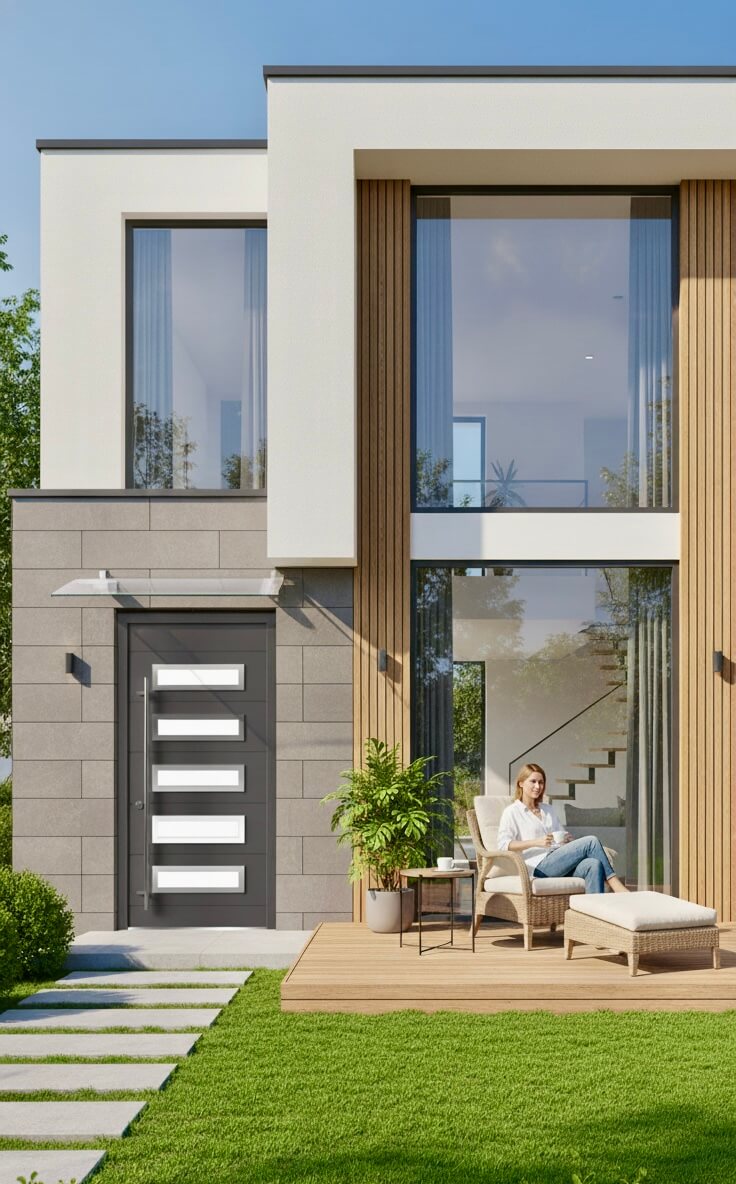 Входная дверь ПВХ со стеклопакетом серии Basic даст возможность подобрать модель двери соответствующую экстерьеру вашего дома. Данная дверь обеспечивает высокую тепло- и шумоизоляцию, не подвержена воздействиям окружающей среды. Входная дверь ПВХ со стеклопакетом Calida дает возможность подбора фурнитуры различного вида на усмотрение клиента. Монтажная глубина двери - 73 мм. Отличительная черта модели CB73-3 – прямоугольные вставки стеклопакета, обрамленные рамкой из нержавеющей стали. Общая площадь вставок из стеклопаекта предоставляет достаточное проникновение дневного света в помещение.